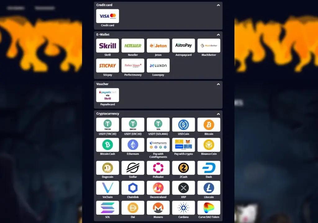 | Payment Methods | Credit Card, Neosurf, Coinspaid, PayID, Interac, EzeeWallet, Jeton, MiFinity, Astropay, Paysafecard, directDebit, CashtoCode, Flexepin, and other country-specific payment methods |